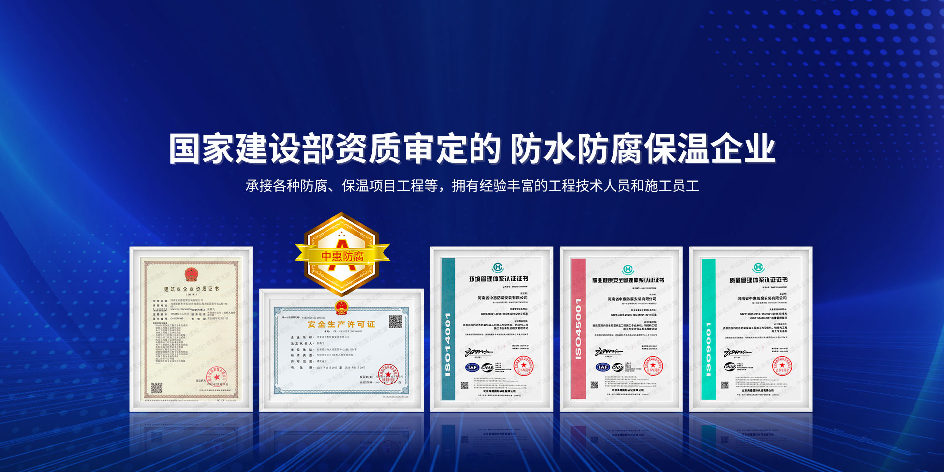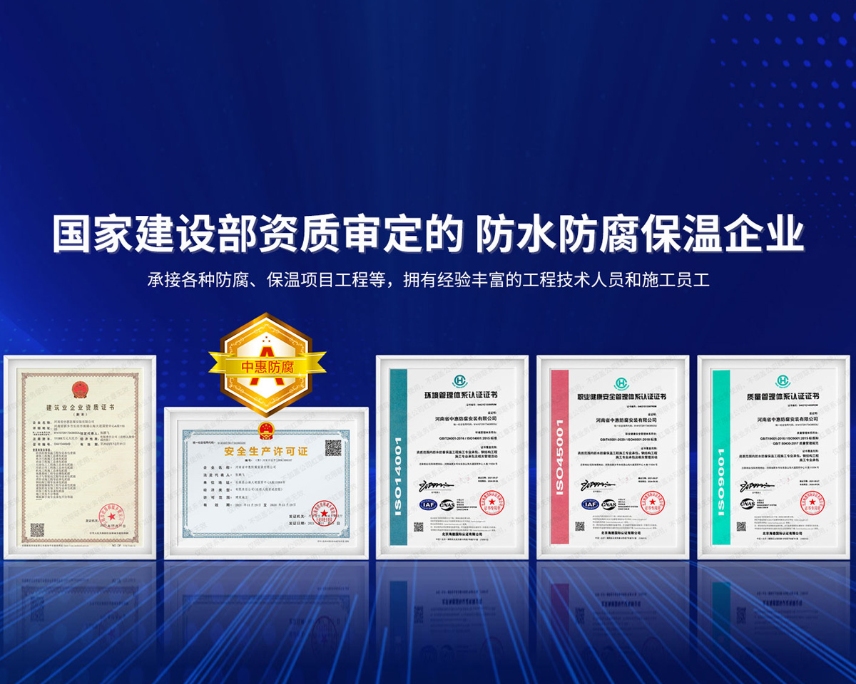 公司經營范圍:防水防腐保溫工程;消防設施工程;建筑裝修裝飾工程;建筑機電安裝工程;電力工程;建筑工程;石油化工工程;工業清洗工程;油罐清洗工程;鋼結構工程;環保工程;模板腳手架工程;電纜防火封堵、防污閃噴涂、外墻外保溫工程;各類施工勞務作業;設備維修、船舶鉚焊、涂裝;電力工程材料、建材、防水材料、防火材料、防腐保溫材料銷售,并相繼通過了GB/T19001-2008idtISO9001:2008GB/T50430-2007質量管理體系認證證書。GB/T24001-2004idtISO14001:2004環境管理體系認證證書。GB/T28001-2011idtOHSAS18001:2007職業健康安全管理體系認證證書。公司是中國防腐蝕于防護協會、中國施工企業管理協會、電力協會和中國鋼結構防水協會會員單位。 公司的經營業務涵蓋了石油、化工、電力、冶金、煤炭、船舶、國防、燃氣、水利、環保、交通運輸、航空及國防軍工和輕紡市政等行業的防腐保溫絕熱設備。鋼結構安裝、防火、防水、金屬噴鍍、聚脲噴繪、陰極保護、防滲透堵漏、玻璃鋼及各種磚版材料襯里、橡膠襯里、煙氣硫和耐酸溶劑腐蝕等工程施工。公司連續十年榮獲“省市先進施工企業”“安全生產先進單位”“重合同,守信用企業”和“AA***資質企業”的稱號。2000年被命名為市級文明單位,2002年被國家工商行政管理局命名為“重合同,守信用的企業”、被中國工業防腐蝕技術協會命名為“防腐蝕企業,能源節約及環境保護領域有豐富的經驗和***的業績。工程一次交驗合格率100%。其中攀枝花鋼鐵公司煉鐵廠四號高爐及熱風爐防腐工程、上海寶鋼公司煤氣柜防腐工程、撫順石油一廠裝置防腐項目、齊魯石化公司稀烴廠高塔防腐工程、吉林化學工業公司煉油廠油罐防腐工程、天津石化熱電廠六號爐頂棚聯絡管保溫工程、大慶油田(太倉)力神泵業工程、中國化學工程第十一建設工程、中原油田勘探局工程、中國石化銷售有限公司華北分部、魯皖輸油管道工程、貴州開磷息烽合成氨工程、陜西黃陵煤化工程、中國石油天然氣西部管道塔里木輸油工程、邯鋼集團邯寶鋼鐵公司煉鐵工程、德州供電工程、吉寶(南通)船廠工程,偃師華潤熱力工程、鄭州熱力總公司。 河南省中惠防腐安裝有限公司愿以豐富的施工經驗,***的技術,***的設備,***的管理,***的服務,竭誠為國內外廣大的用戶提供***滿意、******的工程作品。 我公司愿與國內外同仁一道,團結協作,共同推進防腐蝕行業發展! 公司地址:河南省長垣縣建設路北段360號 固定電話:0373-8866488 郵編:453400 網址:http://www_zhff_com_cn.shanghaizoom.com